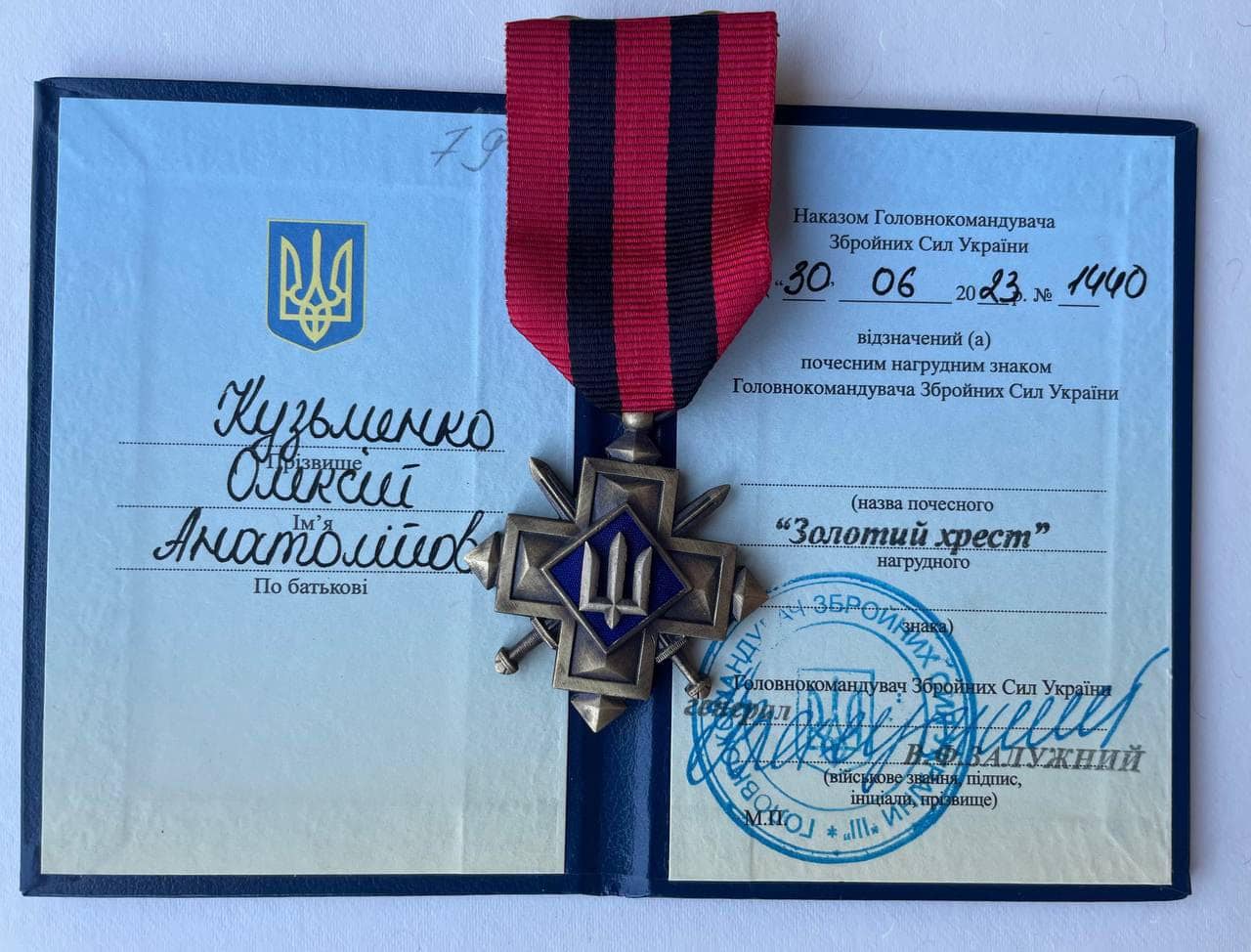 Почесним нагрудним знаком «Золотий хрест» головнокомандувача Збройних Сил України Валерія Залужного нагороджено начальника медичної служби